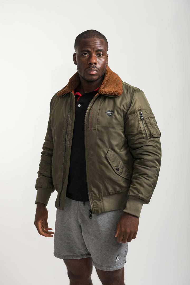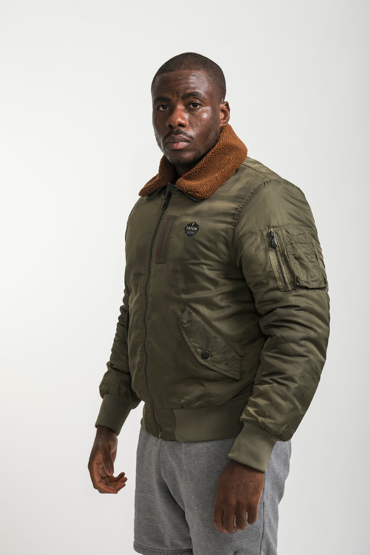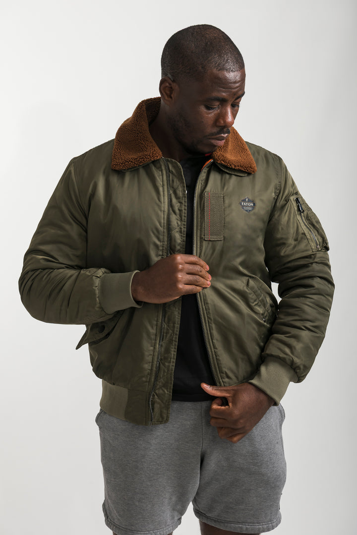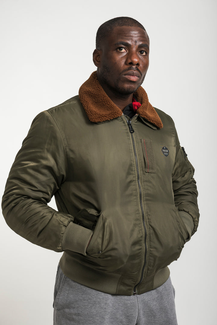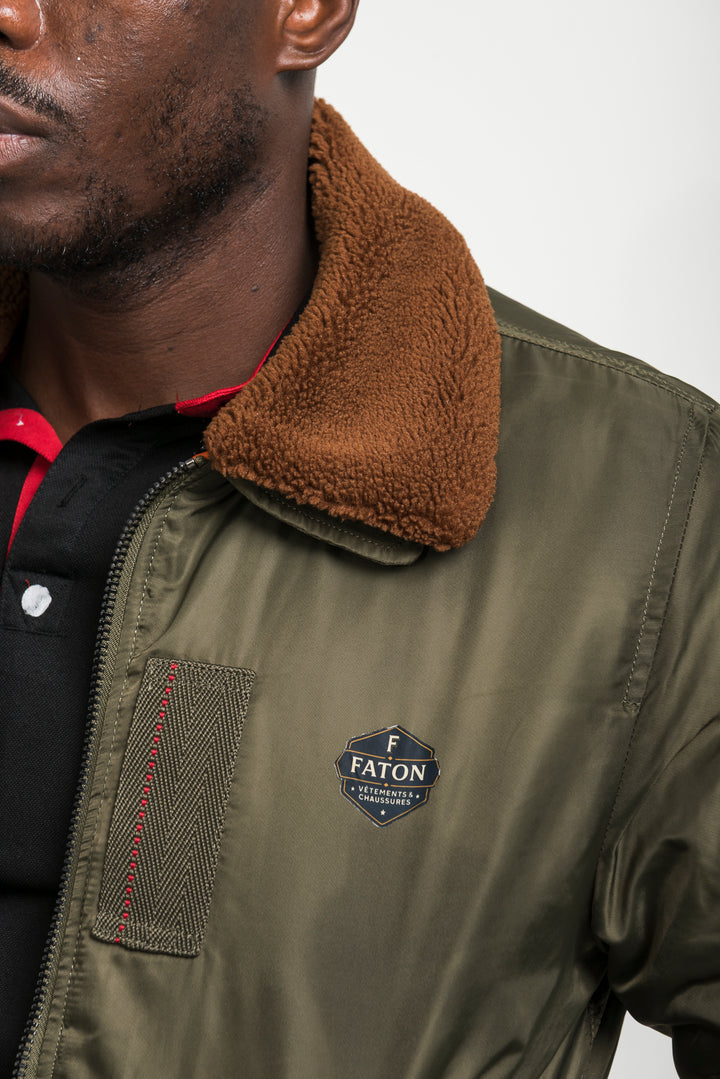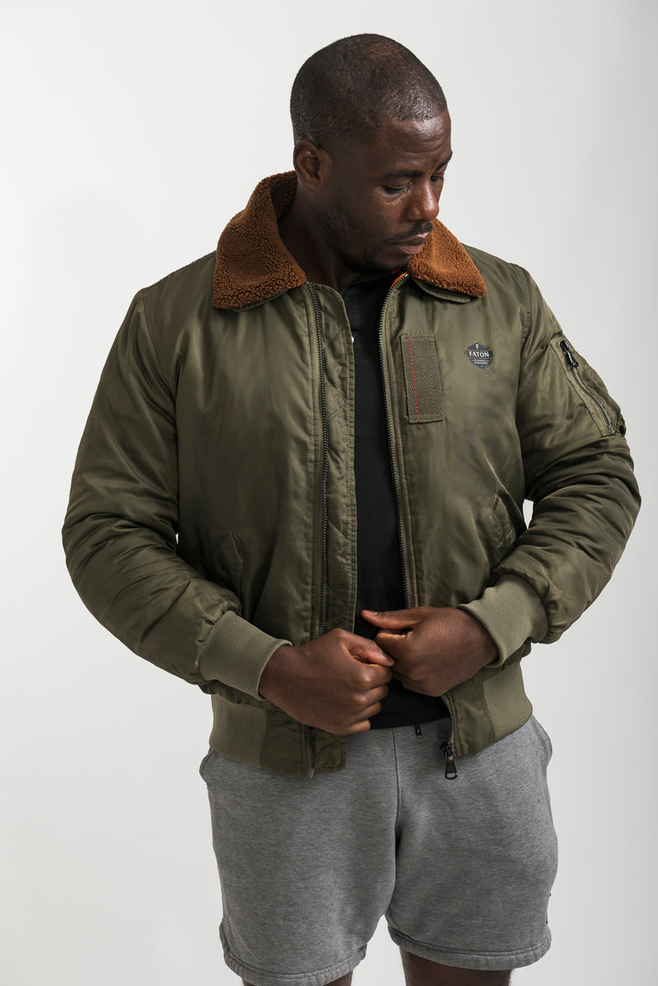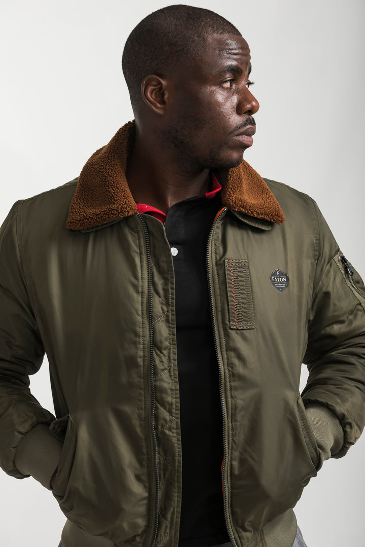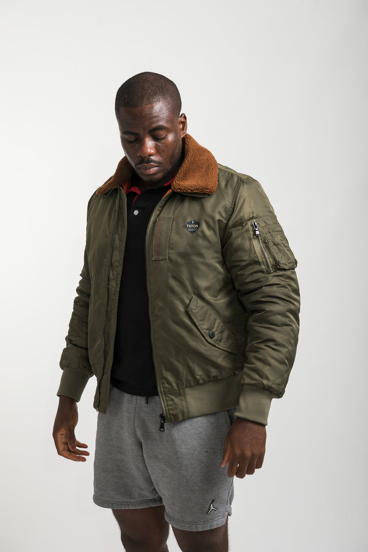 Stay warm and stylish with the Khaki Bomber Jacket featuring a soft shearling collar. Inspired by classic aviator style, this bomber combines timeless design with modern comfort. Finished with ribbed cuffs, long sleeves, and durable fabric, it’s perfect for layering in colder weather.
