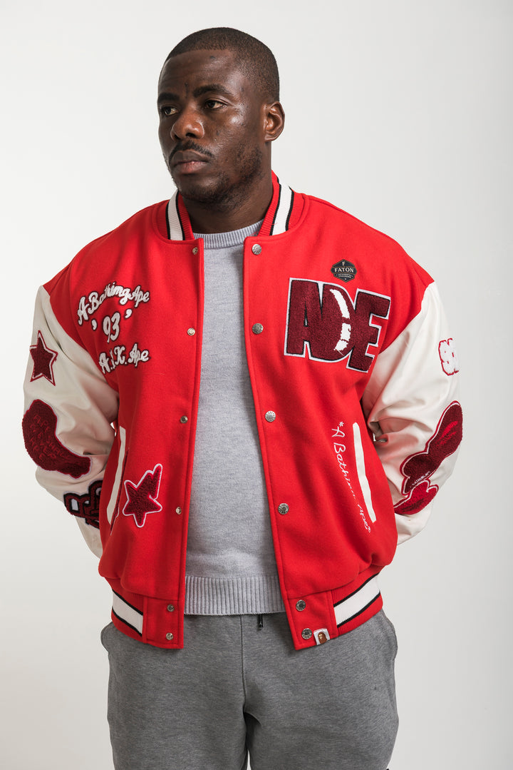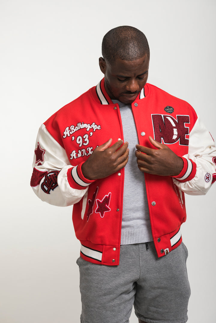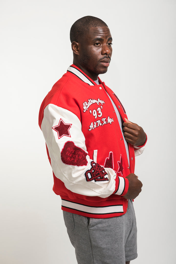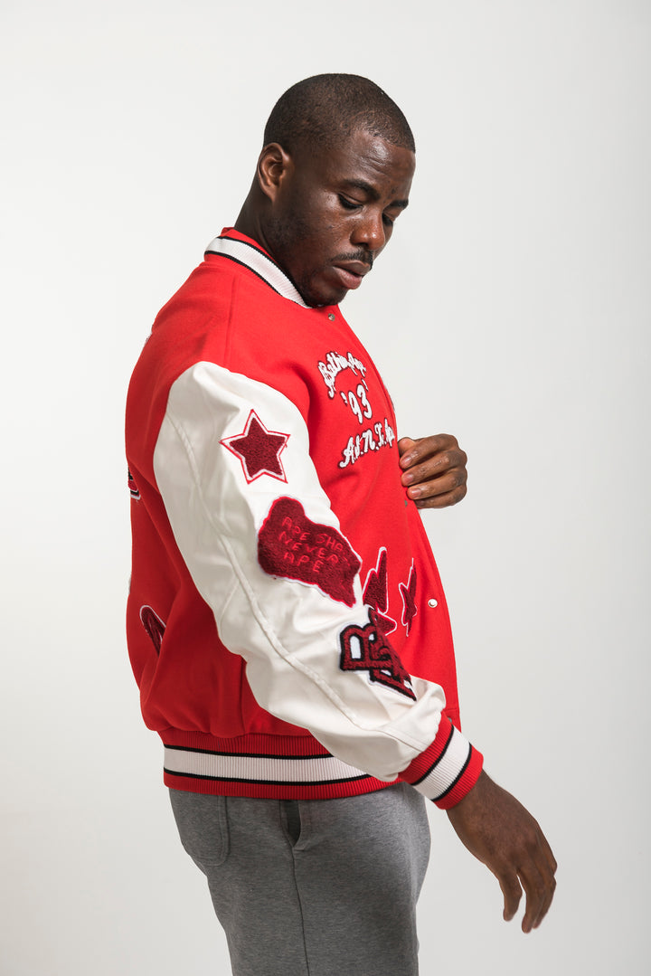 Stand out with the Red Varsity Badge Bomber Jacket, inspired by classic American college style. Featuring bold embroidered patches, contrast sleeves, and striped ribbed trims, this piece is built for statement streetwear. The relaxed fit and durable fabric make it both comfortable and stylish, perfect for everyday wear or standout looks.