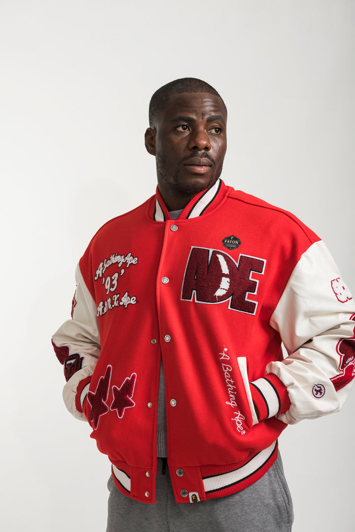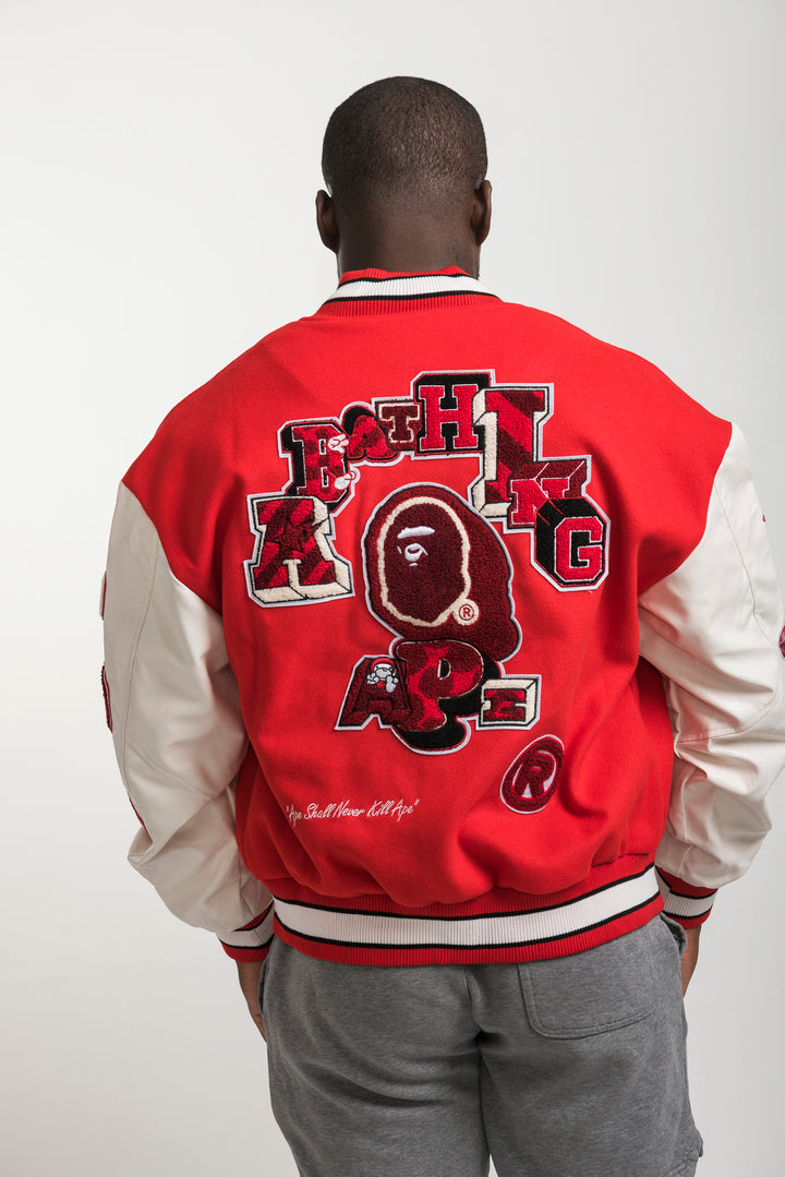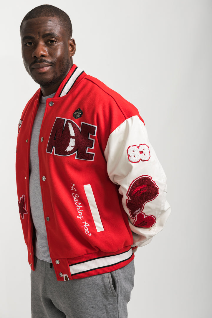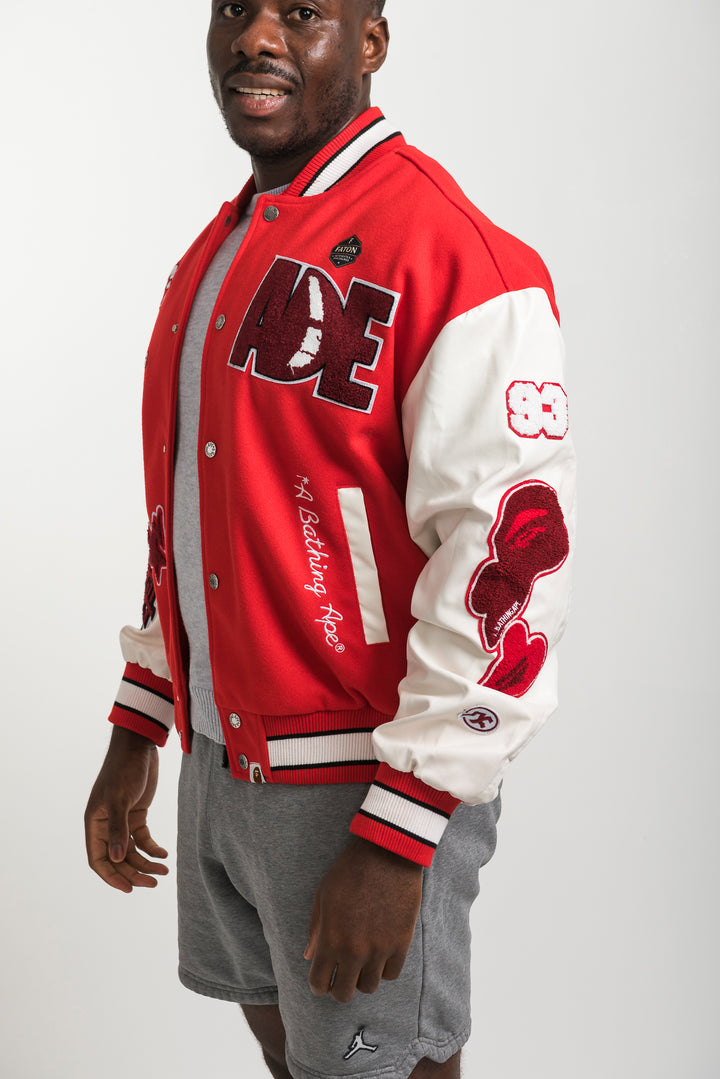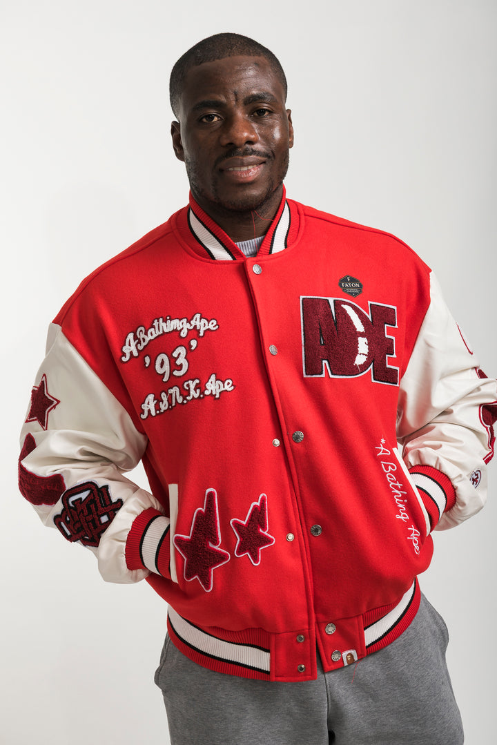 Stand out with the Red Varsity Badge Bomber Jacket, inspired by classic American college style. Featuring bold embroidered patches, contrast sleeves, and striped ribbed trims, this piece is built for statement streetwear. The relaxed fit and durable fabric make it both comfortable and stylish, perfect for everyday wear or standout looks.